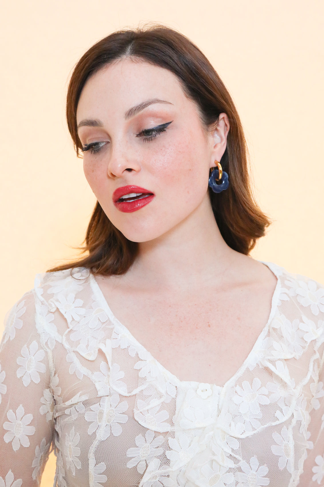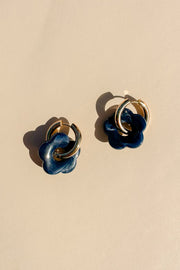 Beautiful and chic gold hoop earrings featuring a hanging resin daisy flower. Available in 10 colors.