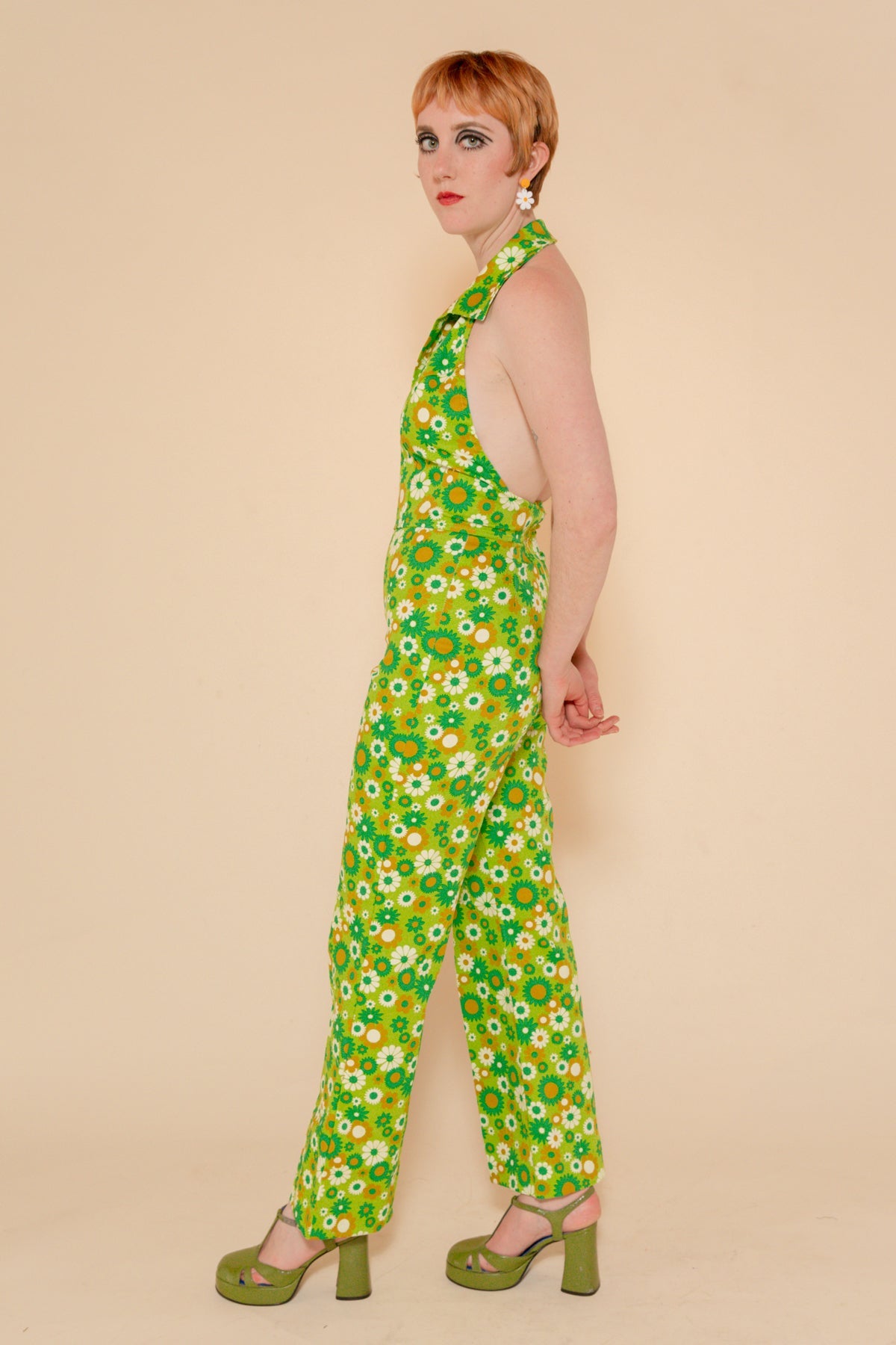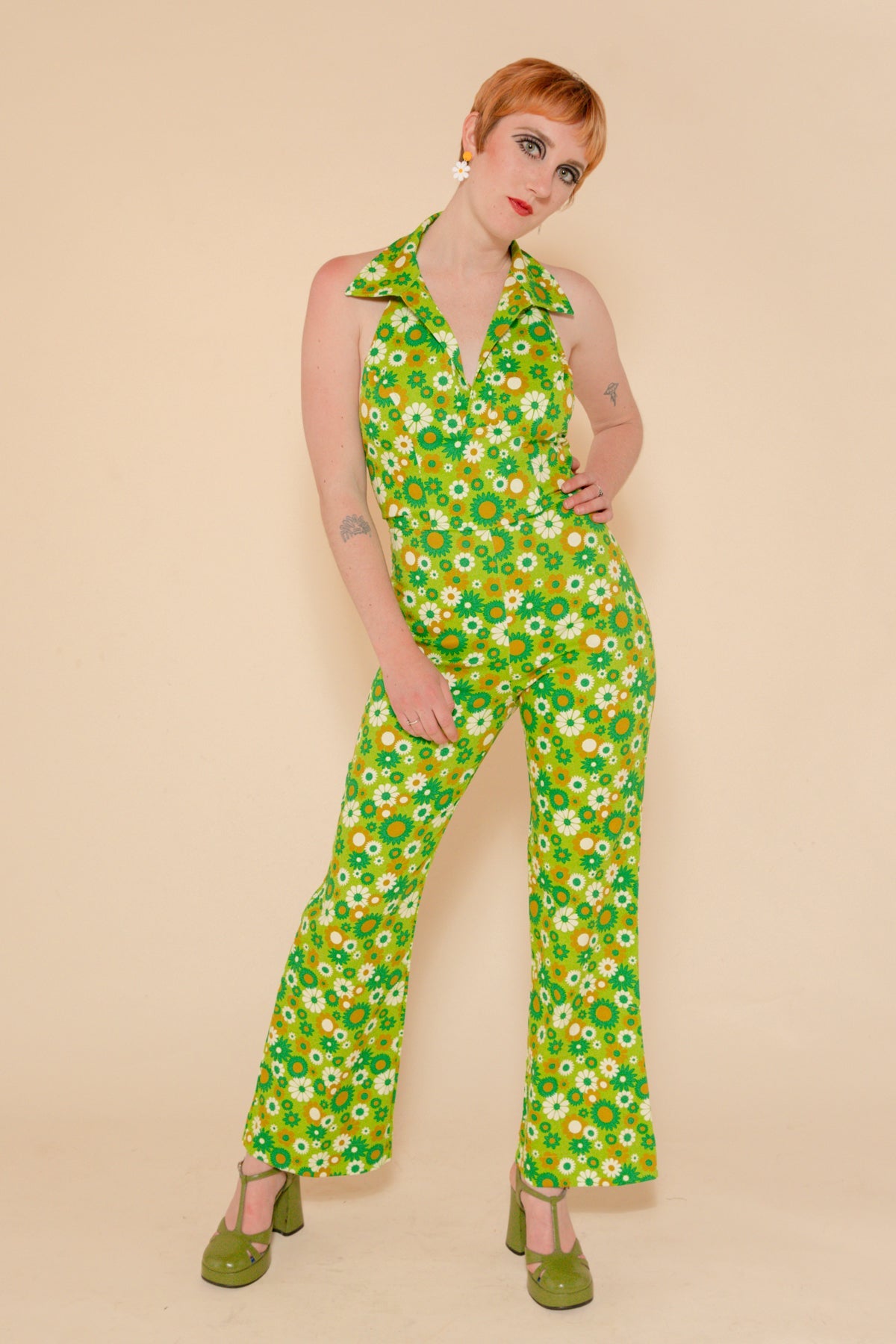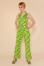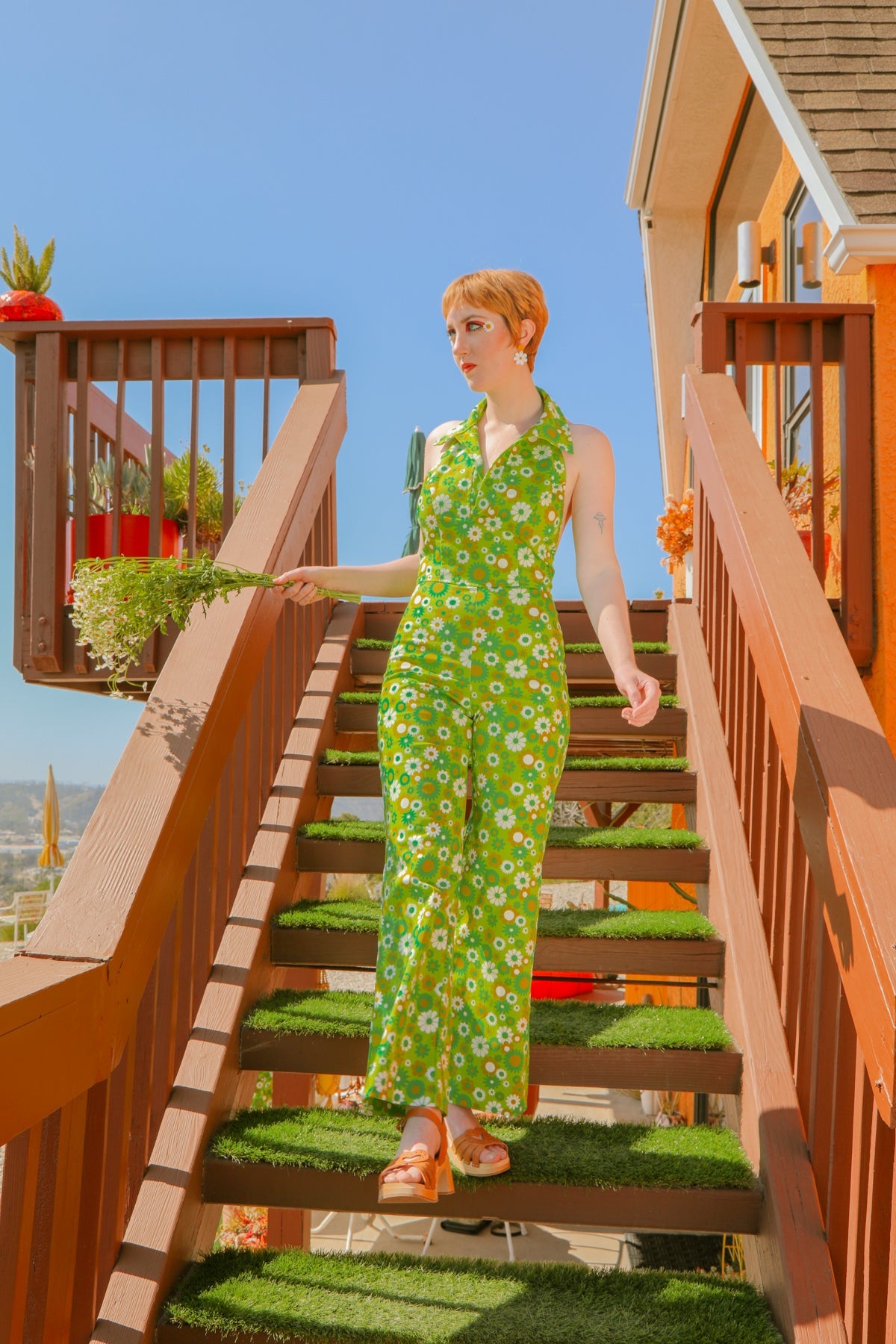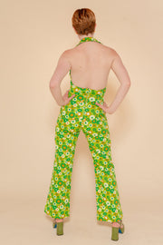 A foxy 70's summer dream! The Cecilia Jumpsuit is the ultimate vintage-inspired jumpsuit for summertime days! Its dreamy details include a halter-top and 70's collar neckline. Our Green Daisy print is a groovy spring dream and the open back will keep you feeling easy breezy.