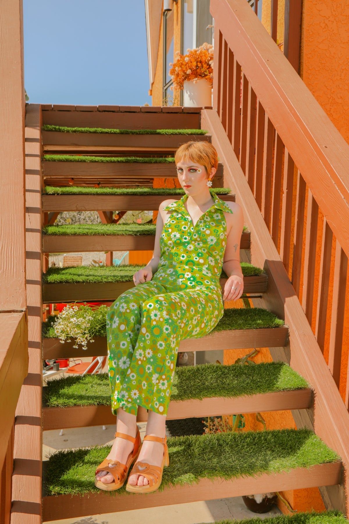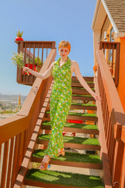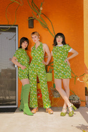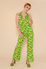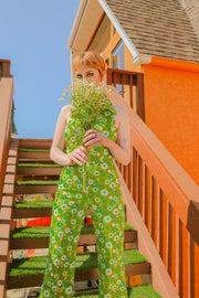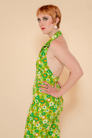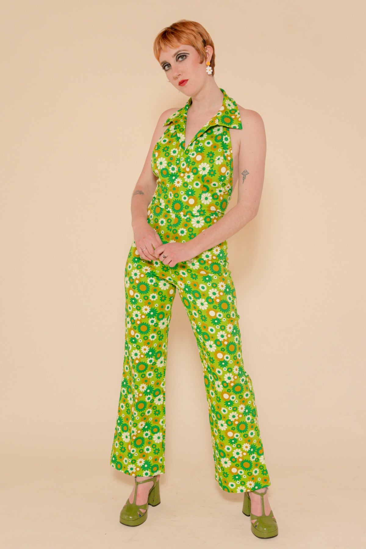A foxy 70's summer dream! The Cecilia Jumpsuit is the ultimate vintage-inspired jumpsuit for summertime days! Its dreamy details include a halter-top and 70's collar neckline. Our Green Daisy print is a groovy spring dream and the open back will keep you feeling easy breezy.