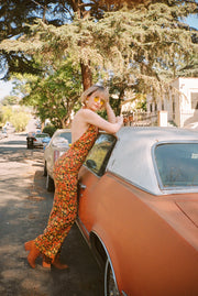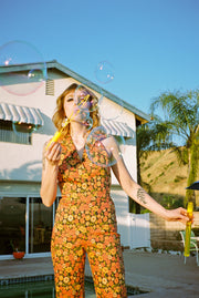 A foxy 70's summer dream! The Cecilia Jumpsuit is the ultimate vintage-inspired jumpsuit for summertime days! Its dreamy details include a halter-top and 70's collar neckline. Our coveted Marigold print is sunshine personified and the open back will keep you feeling easy breezy. Be prepared for nonstop compliments, this is a customer favorite!