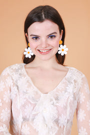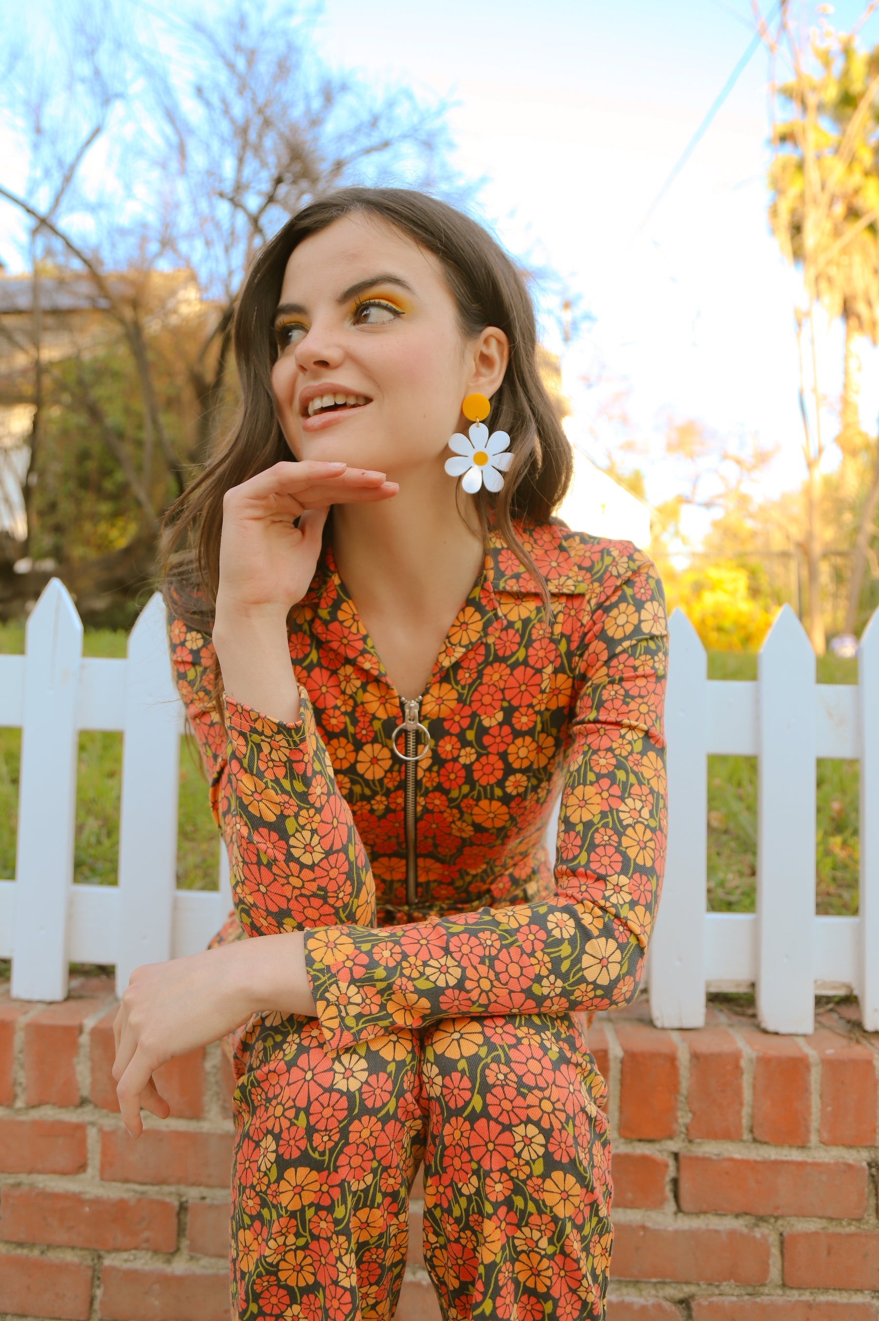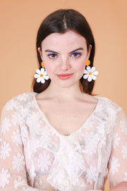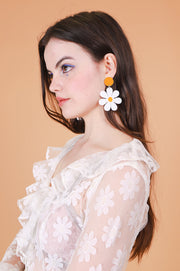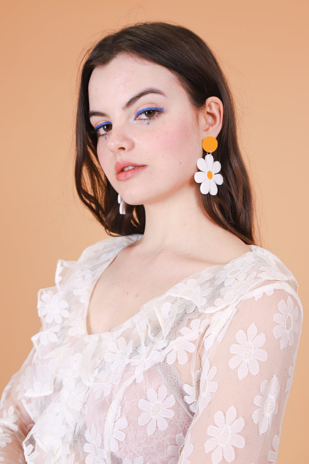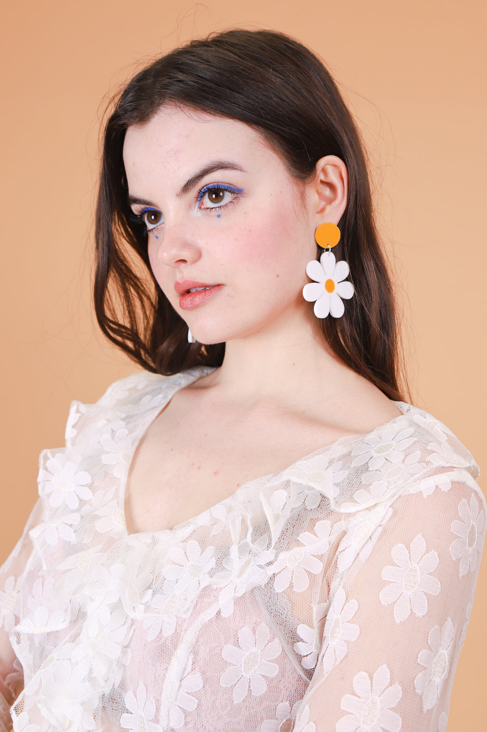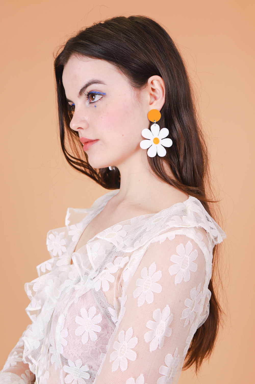 The cutest '70s inspired daisy earrings in the large full size! Handmade with high-quality and durable acrylic. These are extremely lightweight and easy to care for. Earrings are on nickel-free, sterling silver posts making them hypoallergenic and safe for all!