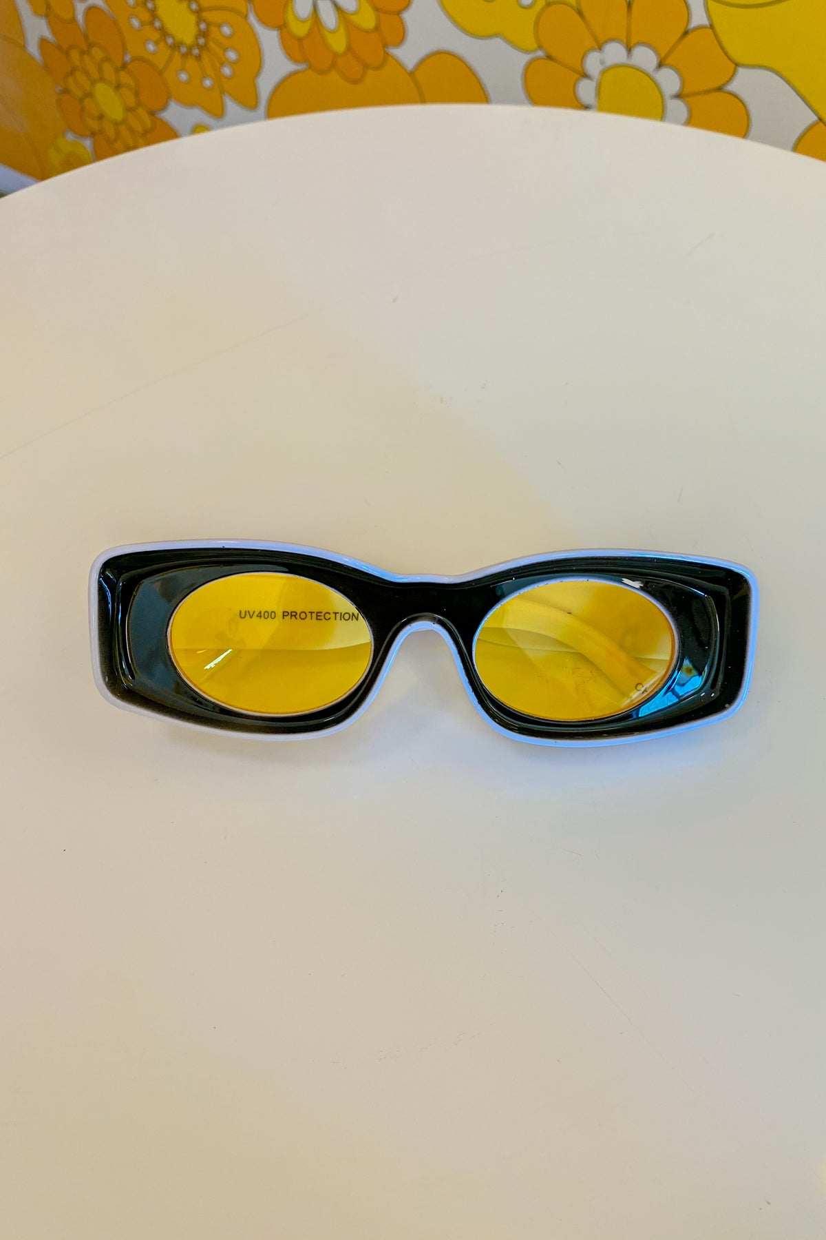 1960's inspired oversized mod sunglasses featuring yellow lens and black/white frame! ✿