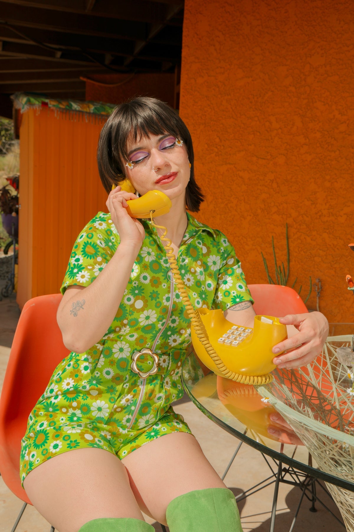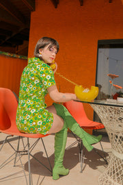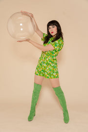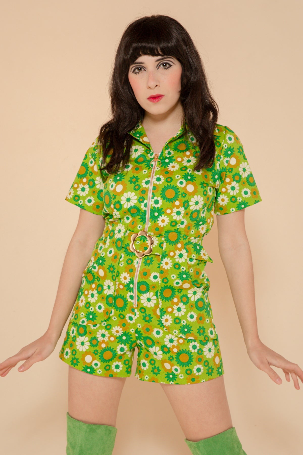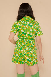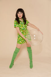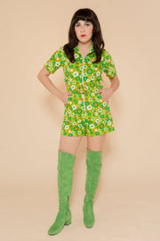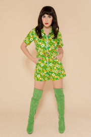 The Green Daisy Romper combines a vintage-inspired cut with contemporary comfort. Its dreamy details include an oversized O-ring zip and 70's collar neckline. Our Green Daisy print is a groovy 70's spring dream. Be prepared for nonstop compliments.