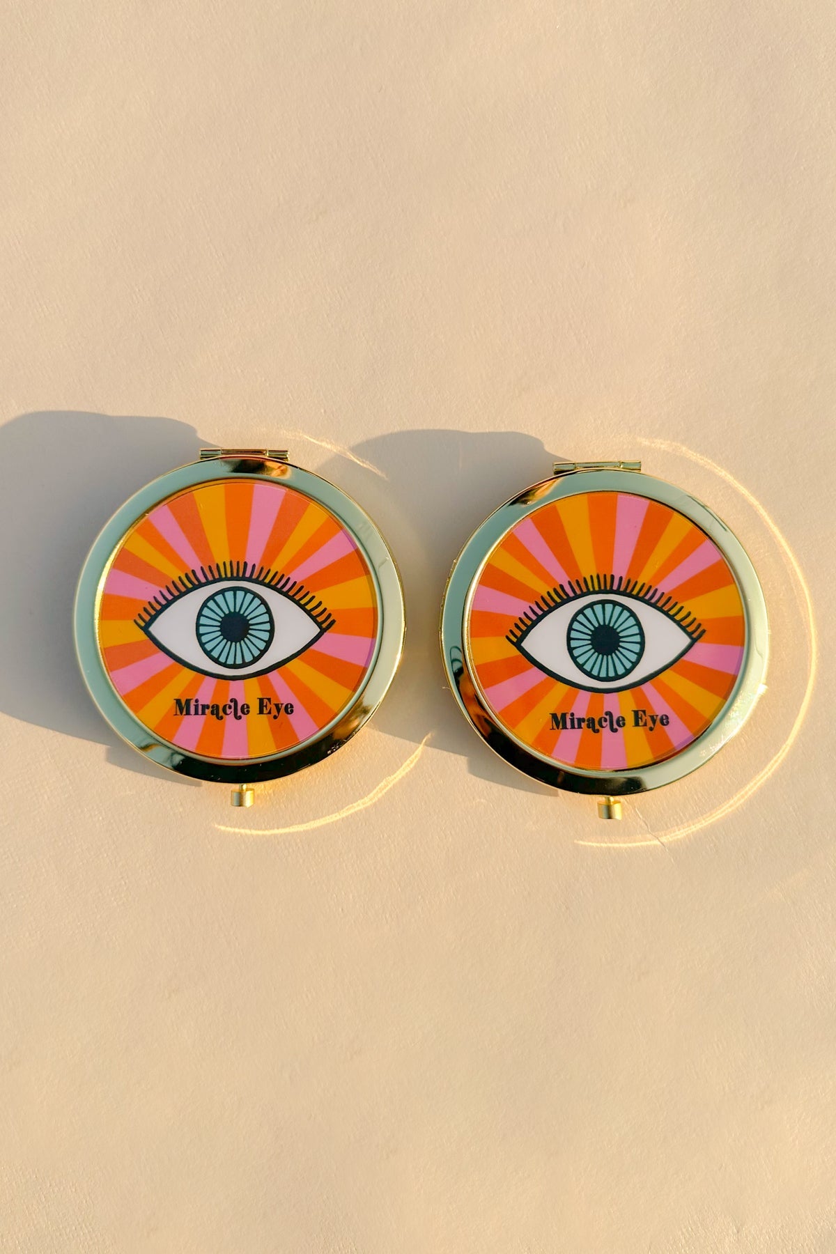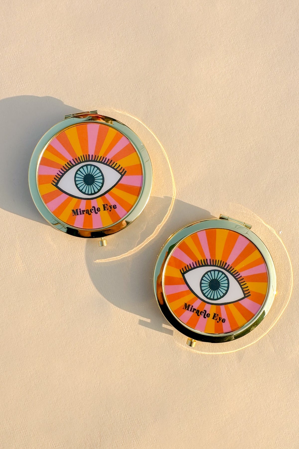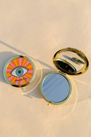 Beautiful gold-plated mirror compact to take everywhere featuring our iconic rainbow eye logo. Luxurious with a great weight, feels solid and secure. Opens to one 10x magnifying mirror, and another true view reflection for on-the-go touchups. Functional art that's more than a mirror 🌈