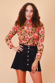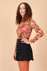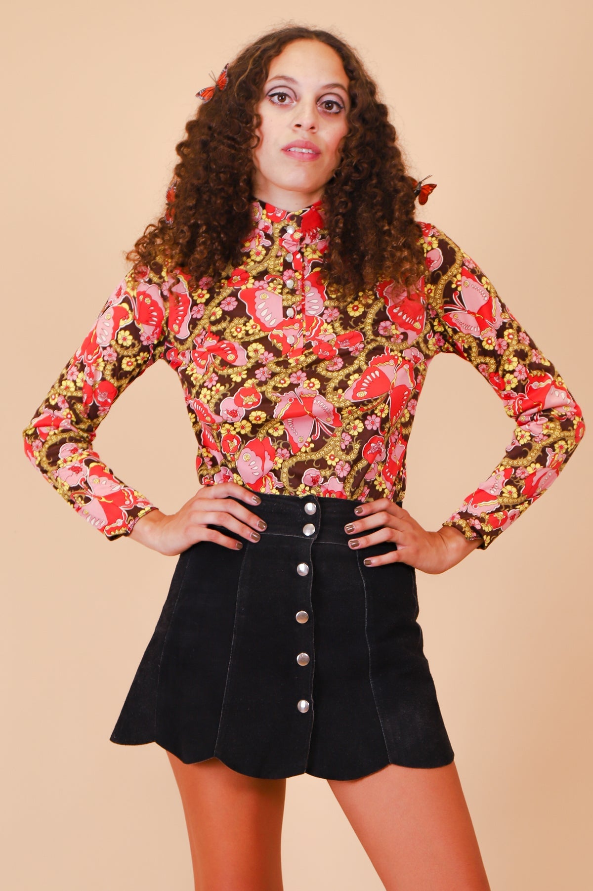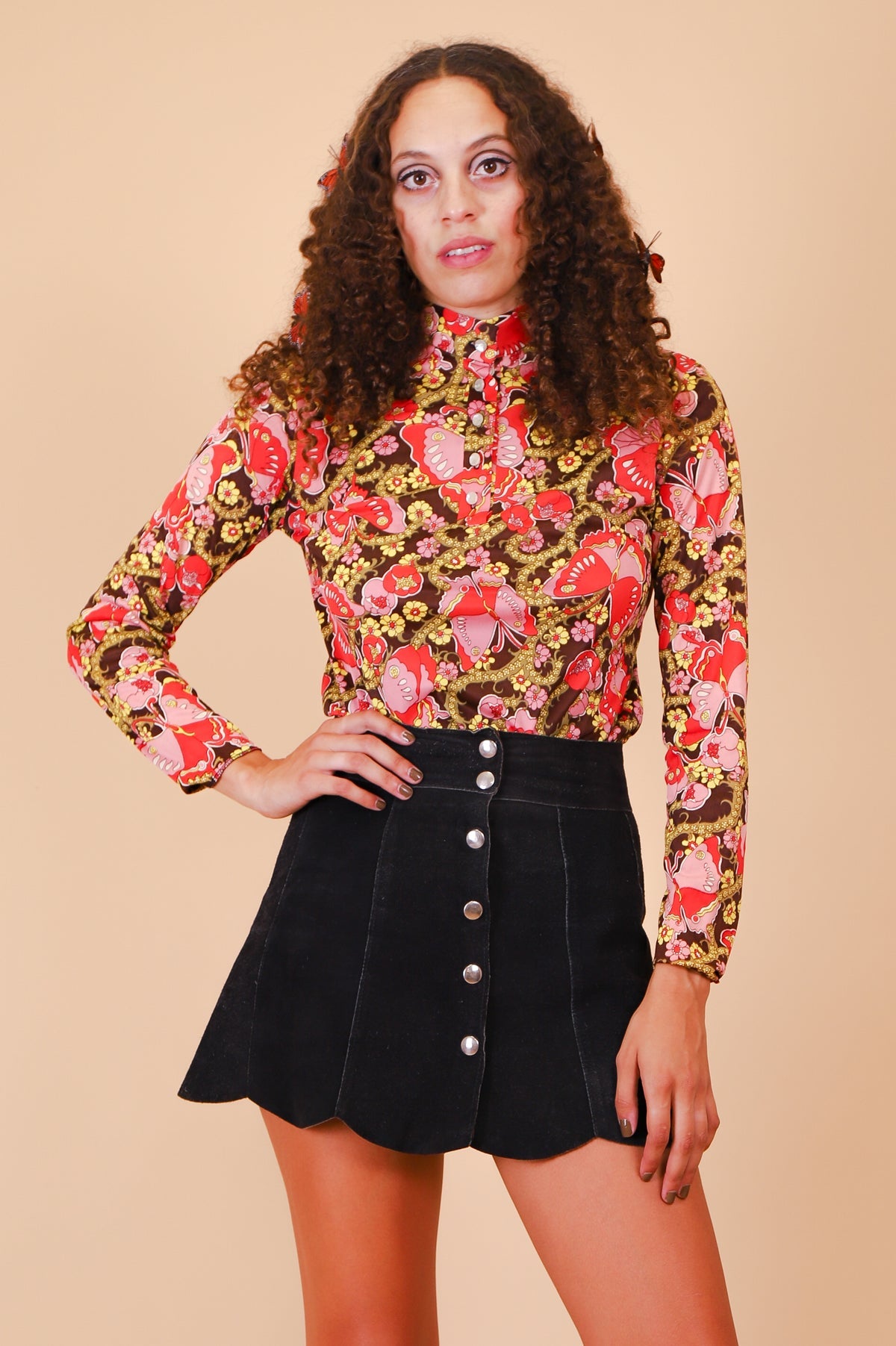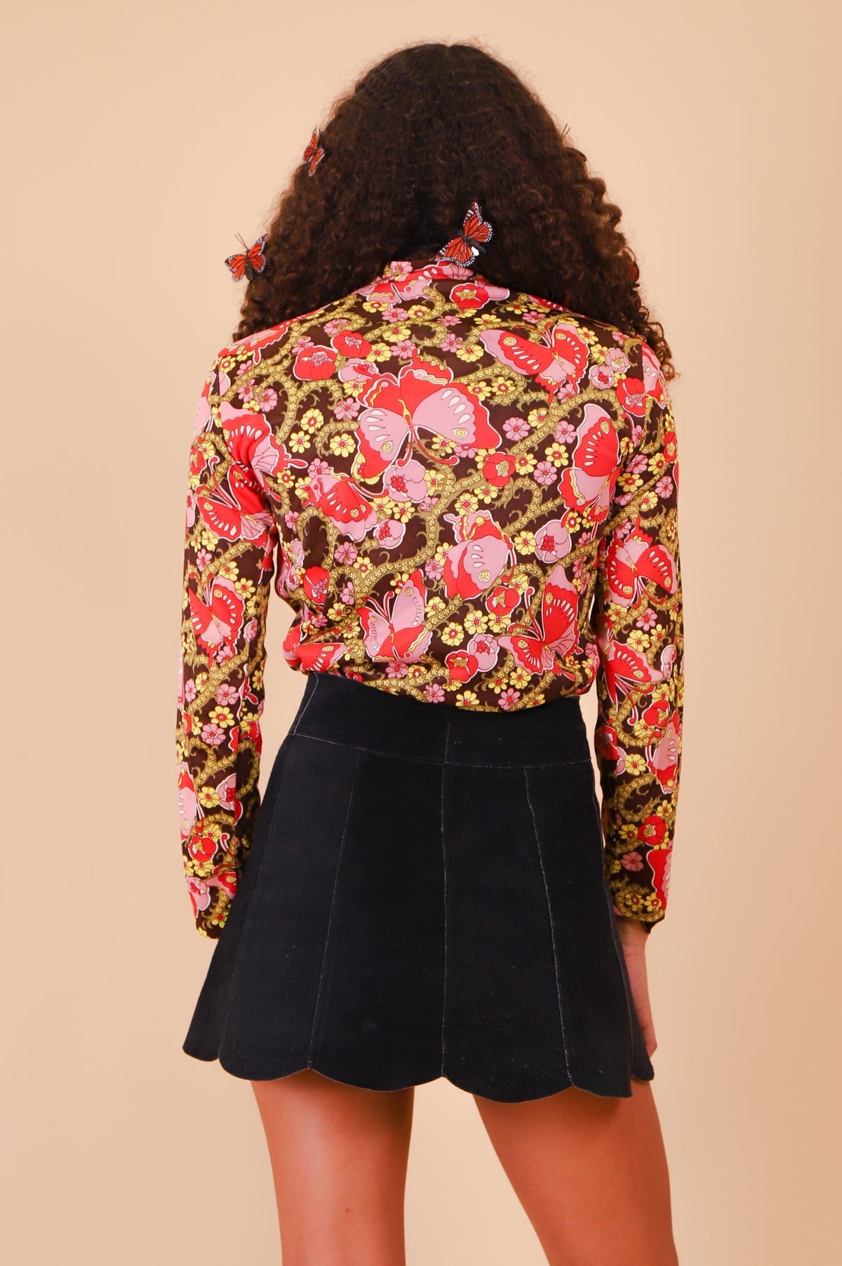 ❁ Fantastic '60s long-sleeve top featuring a psychedelic butterfly and floral print throughout! Dreamy chocolate, pink, yellow, and cranberry-red hues throughout. Mandarin-style neckline with clear acetate button essentials. Ultra soft and comfy with stretch. Ultra rare and special! This one comes from our personal collection, stored for years! ❁