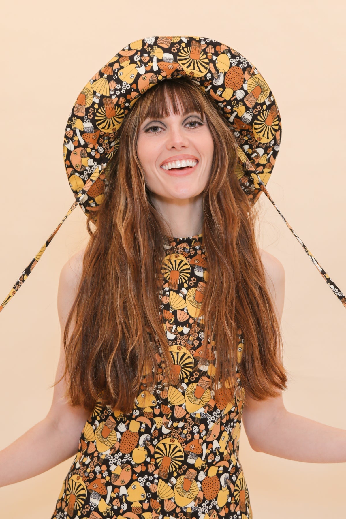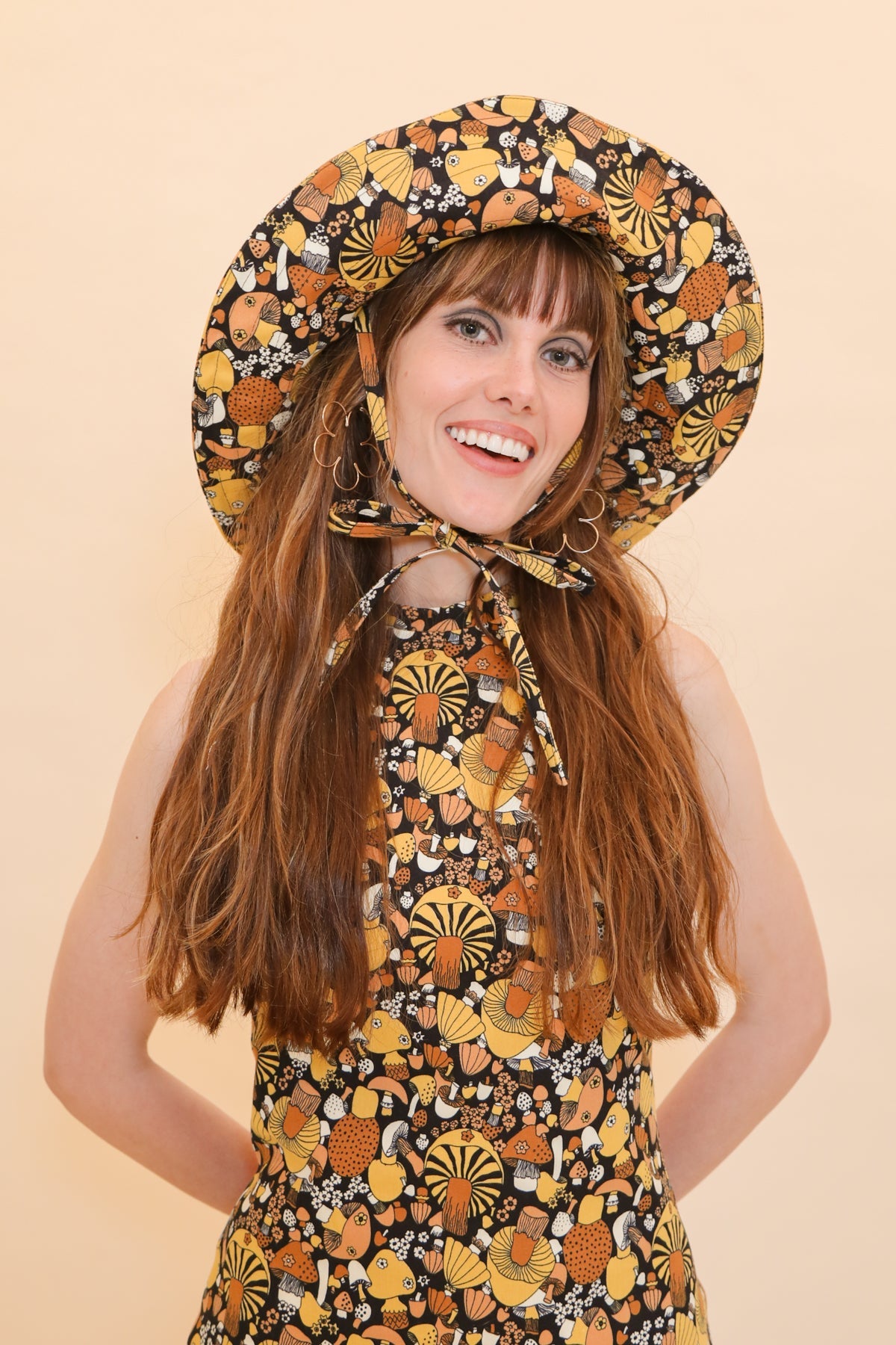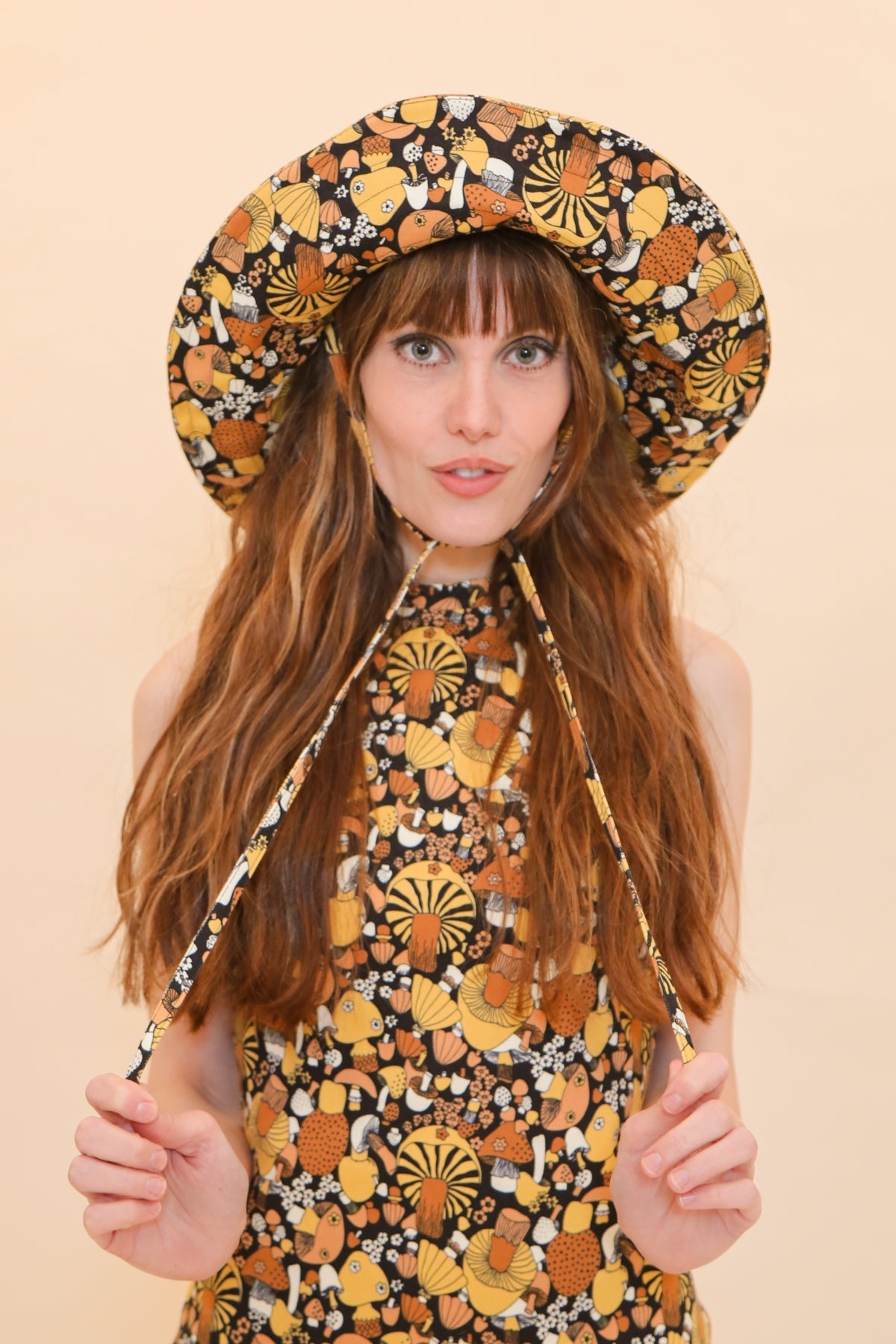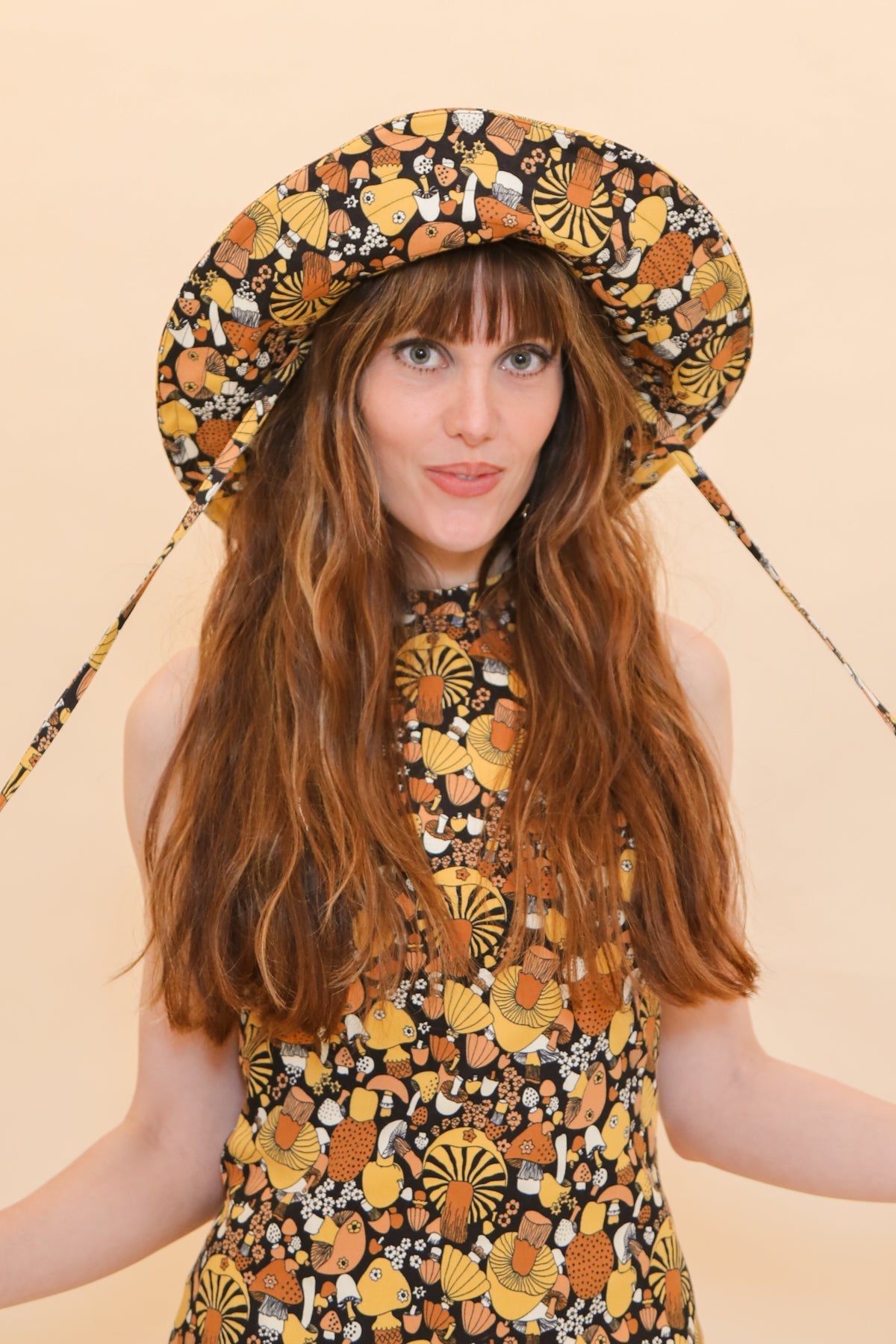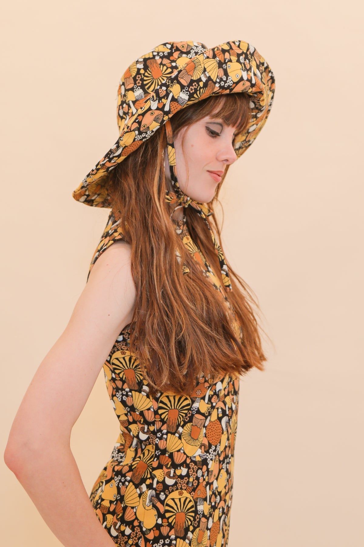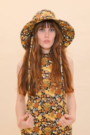 Dreamy '70s-inspired wide brim sun hat! Finished with an adjustable neck tie to secure hat to your head. We love it folded on front!