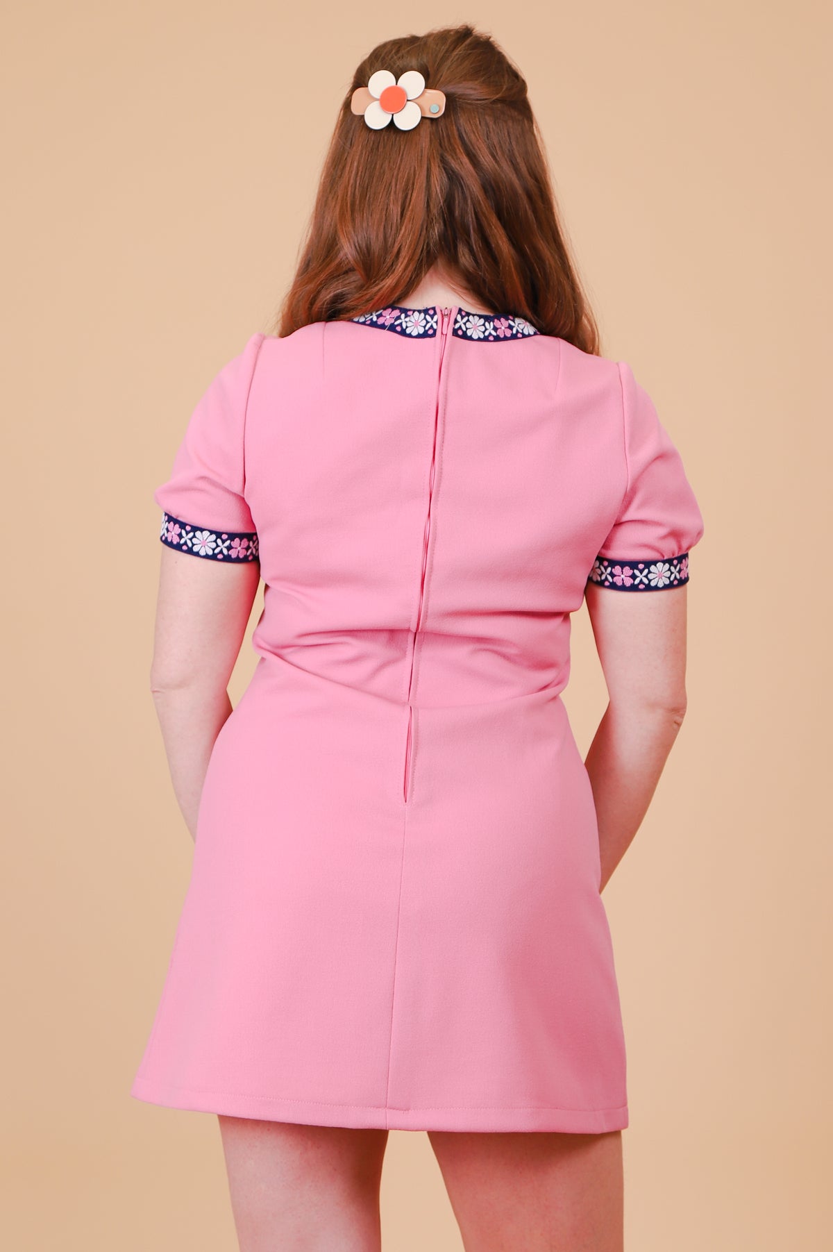 ❁ Adorable little '60s mini-dress in the perfect pink shade featuring embroidered floral trim details throughout! Lace-up front bust. Dreamy fit throughout. Fully-lined with a soft polyester. Zip-up back closure. Ultra soft, comfy, with some stretch. Just YES to this cutie! ❁