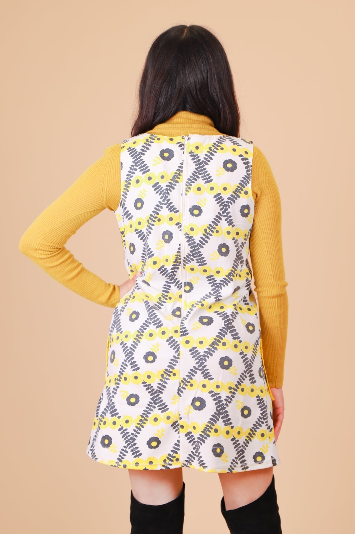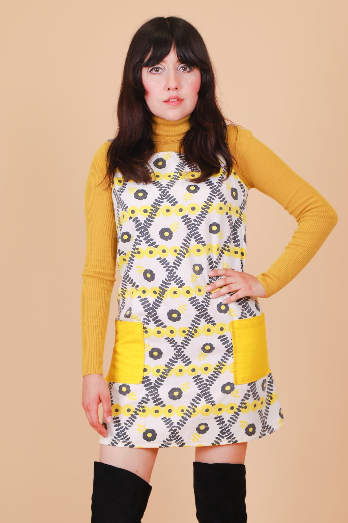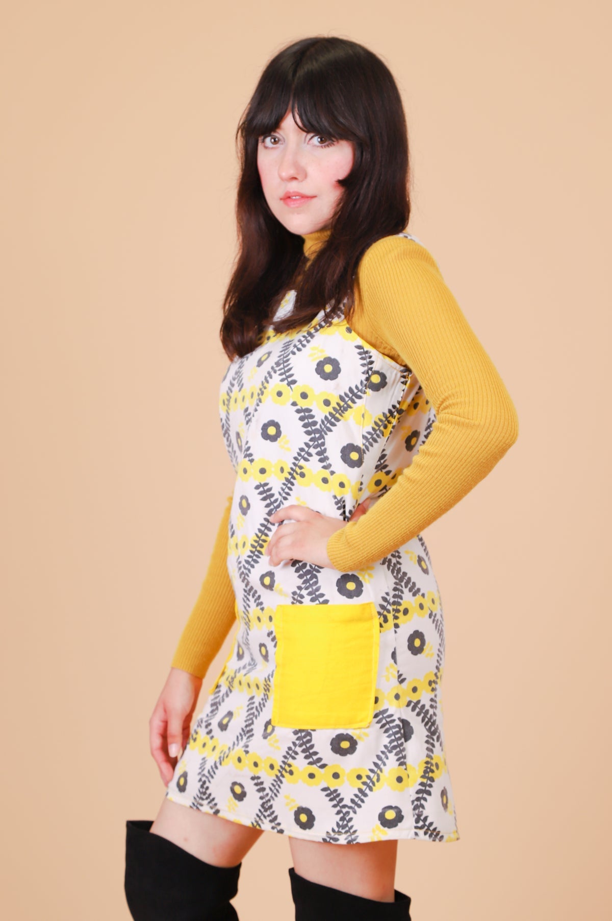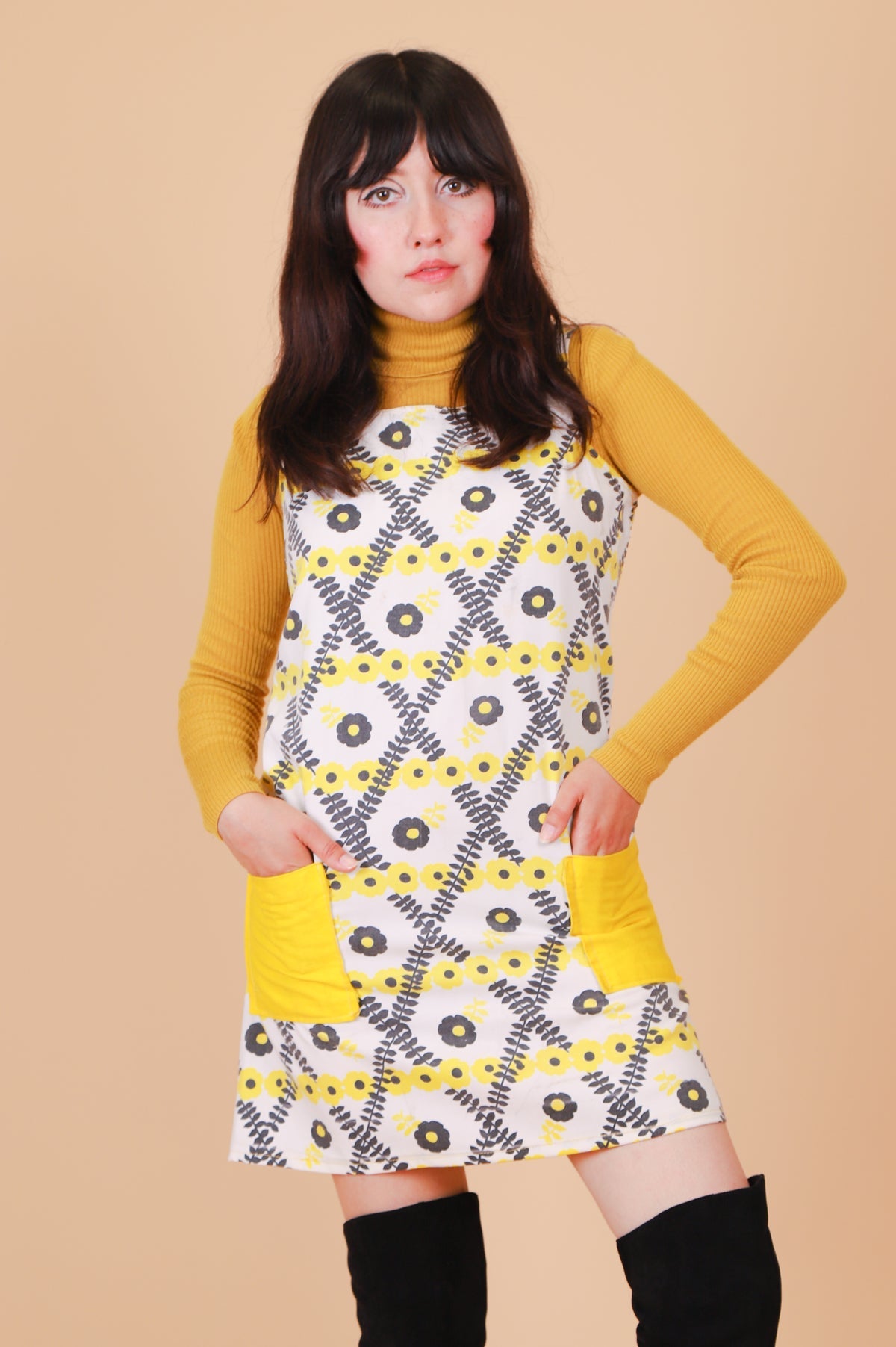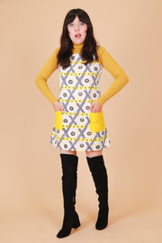 ❁ Adorable vintage '70s mini-dress featuring a daisy print in bright yellow and black against a fresh & incredibly soft white cotton. Bright yellow color-block pockets on front -- SO cute! Zip-up back. Perfect for layering with statement blouses or your favorite turtleneck. Relaxed fit. Ultra soft and comfy with no stretch. This baby had all kinds of work & tailoring done to make her wearable! So, so good! ❁