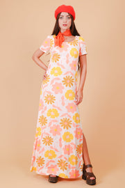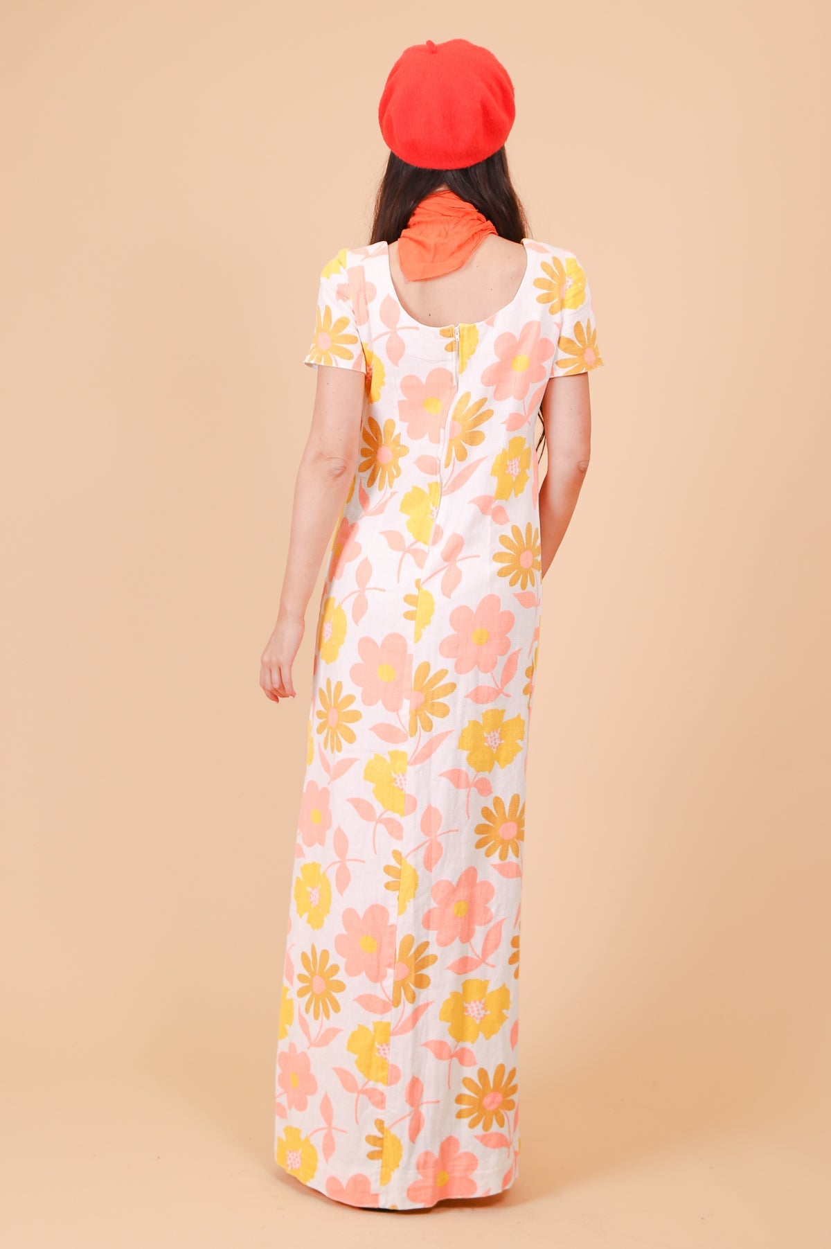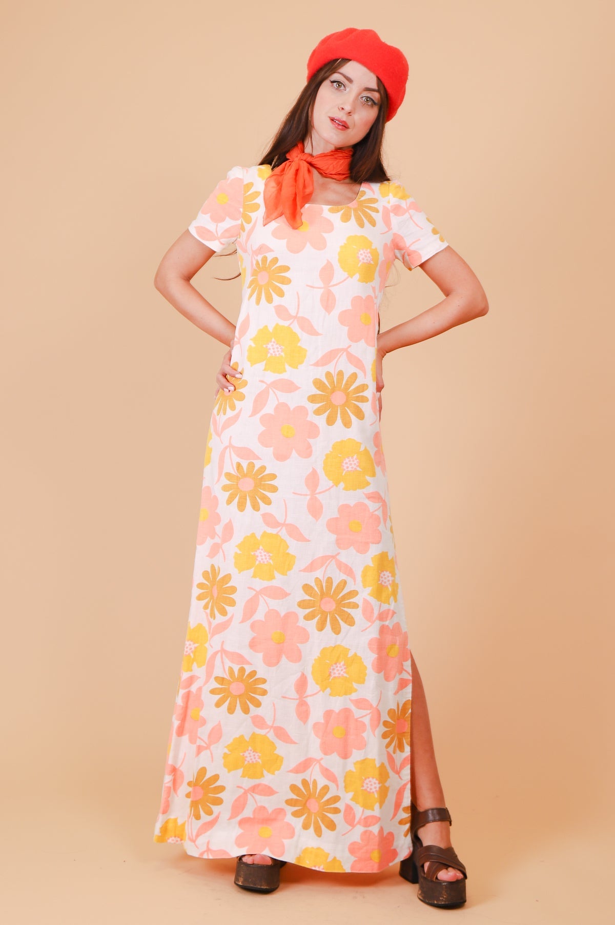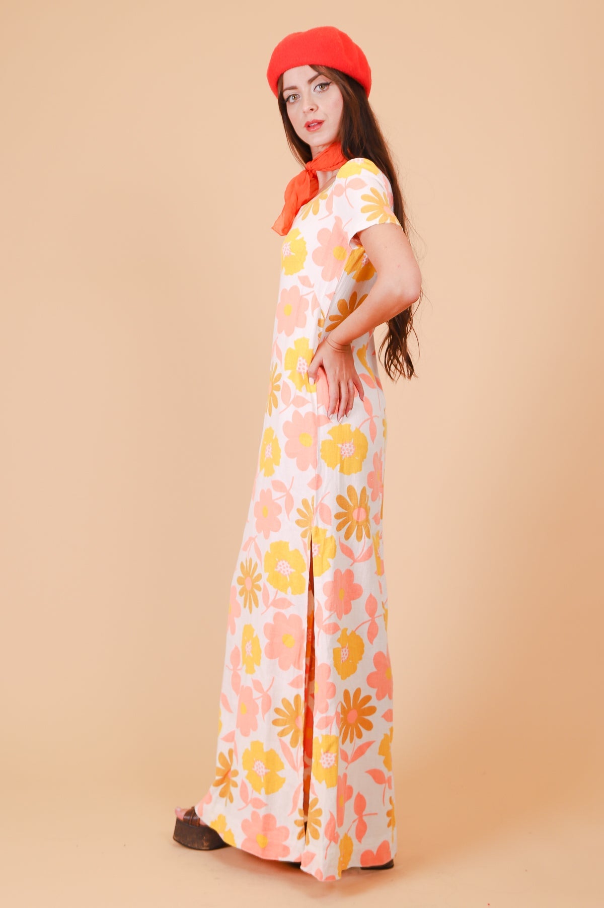 ❁ Supremely special vintage '70s maxi featuring a daisy print throughout in pink, caramel, and golden-yellow hues against a cream. Absolutely incredible slim fit and features a side slit. Zip-up back closure for easy on and off. Ultra soft and comfy with no stretch. So, so dreamy! This one comes from our personal collection. ❁