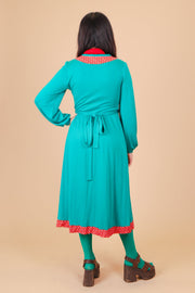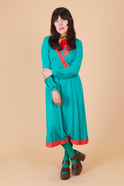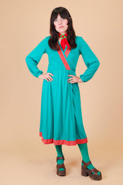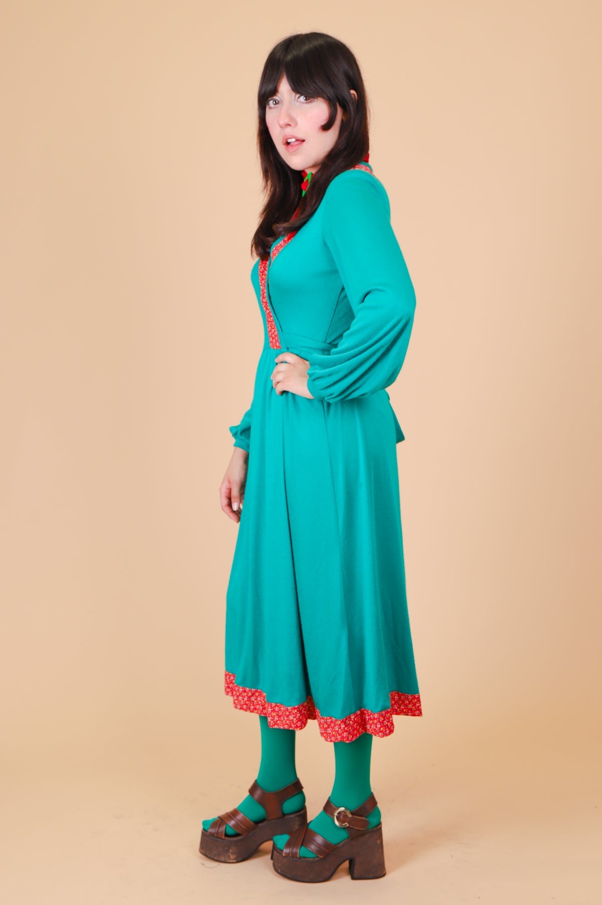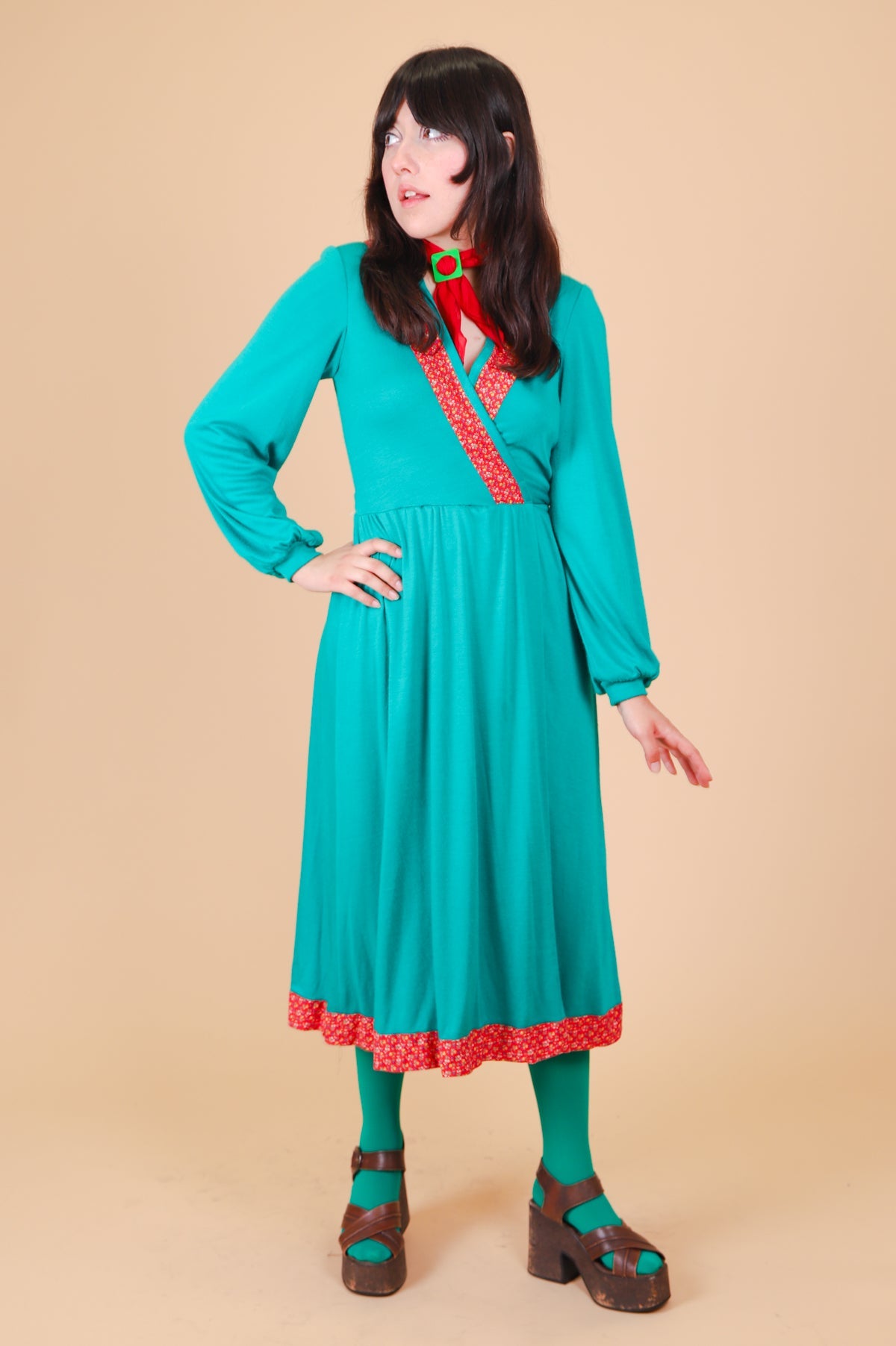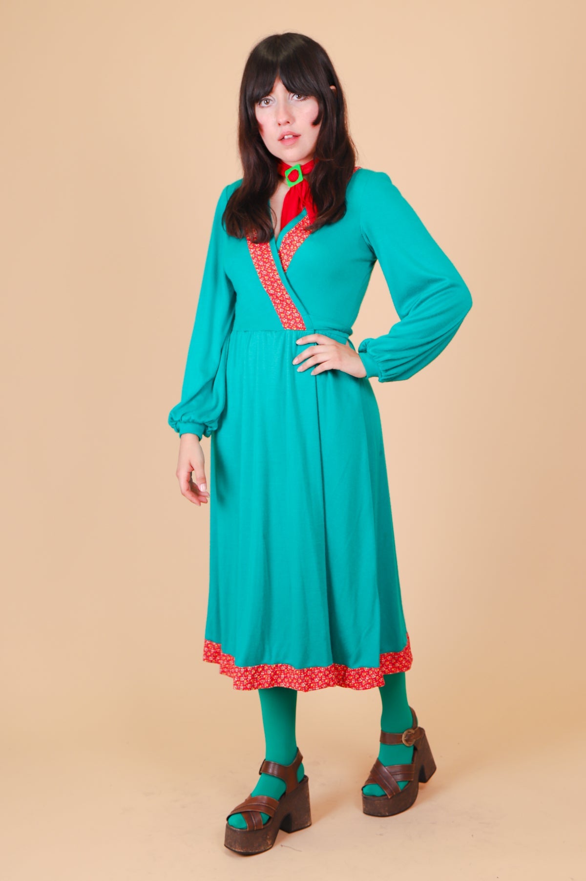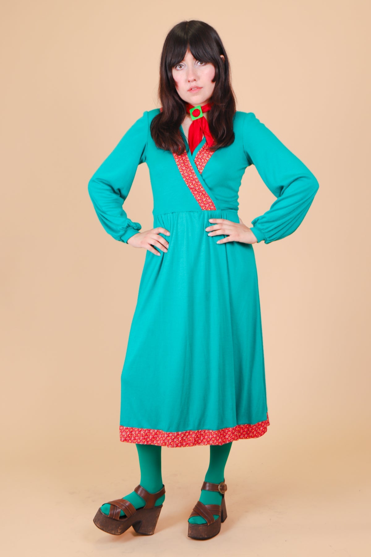❁ Dreamy vintage '70s midi-length dress in a bright green hue with contrasting floral red patchwork detail throughout. Super comfy, wraps around to ensure a perfect fit with adjustable tie-waist belt. Form-fitting at bust and hip, then relaxed below. Poet-style long sleeves. Ultra soft, comfy, and has stretch. A classic 70s babe dress, perfect for Spring. ❁