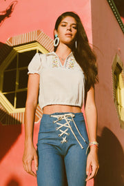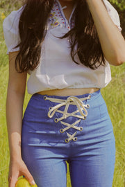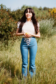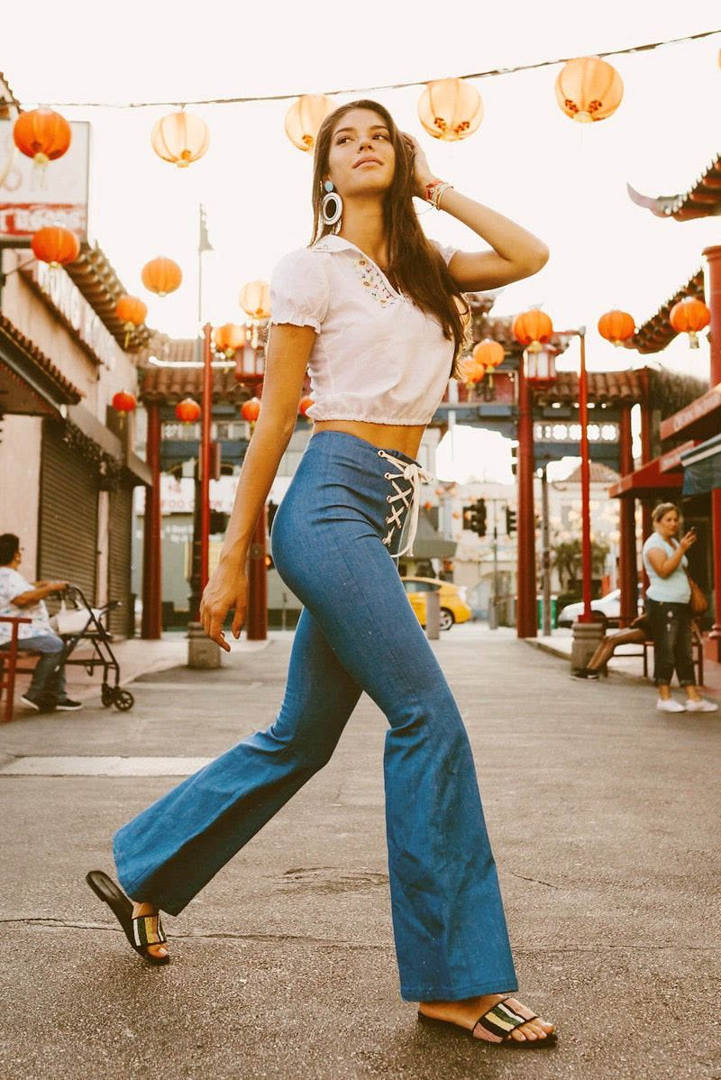 Our take on '70s denim bell bottom jeans featuring a vintage-inspired lace-up front. The dreamiest & comfiest pants in all the land. These babies are compliment machines! ✿